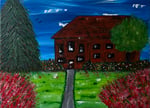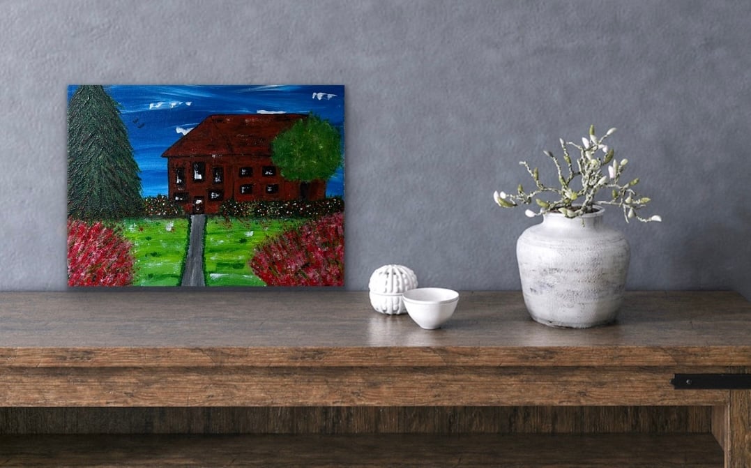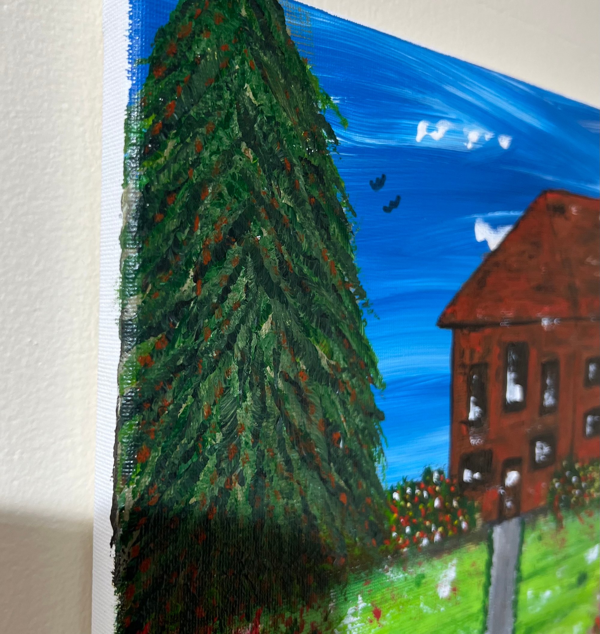 Nestled beneath an open blue sky, Country Serenity captures the quiet charm of a countryside home surrounded by nature’s embrace. The brick-red house stands proudly among blooming hedges, a tall evergreen, and bursts of color that hint at spring’s renewal. The pathway leading home feels both welcoming and timeless — a gentle reminder that peace can be found in simple places and familiar views.